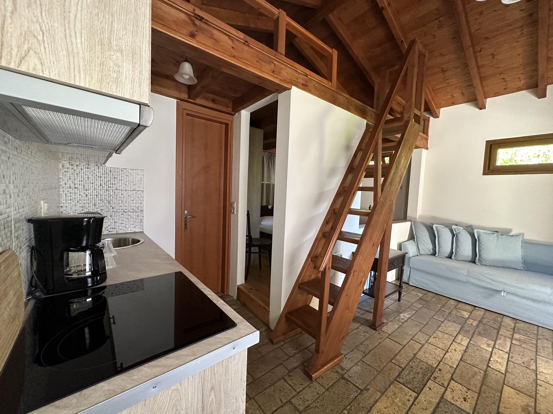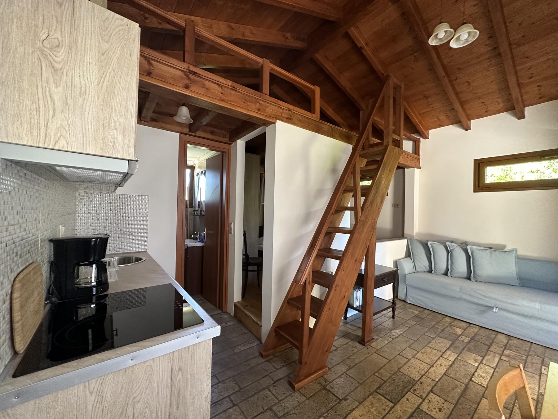 Rooms: 1 bedroom, kitchenette, bathroom, attic and veranda with pergolas and garden.